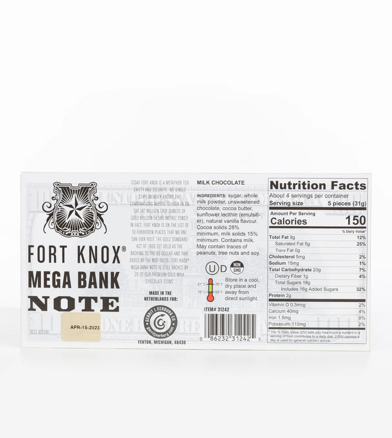 Indulge in the ultimate chocolate experience with the Fort Knox® Mega Banknote! This fun, oversized bar is designed to look like a giant banknote. Packed with 20 smooth, creamy, milk chocolate coins, each coin delivers a satisfying, indulgent taste that will satisfy even the sweetest cravings. Whether you're celebrating a special occasion, treating yourself, or sharing a fun gift, the Fort Knox Mega Banknote is the perfect way to make any moment feel like a million bucks! 💵✨