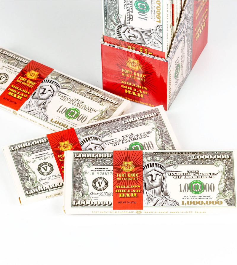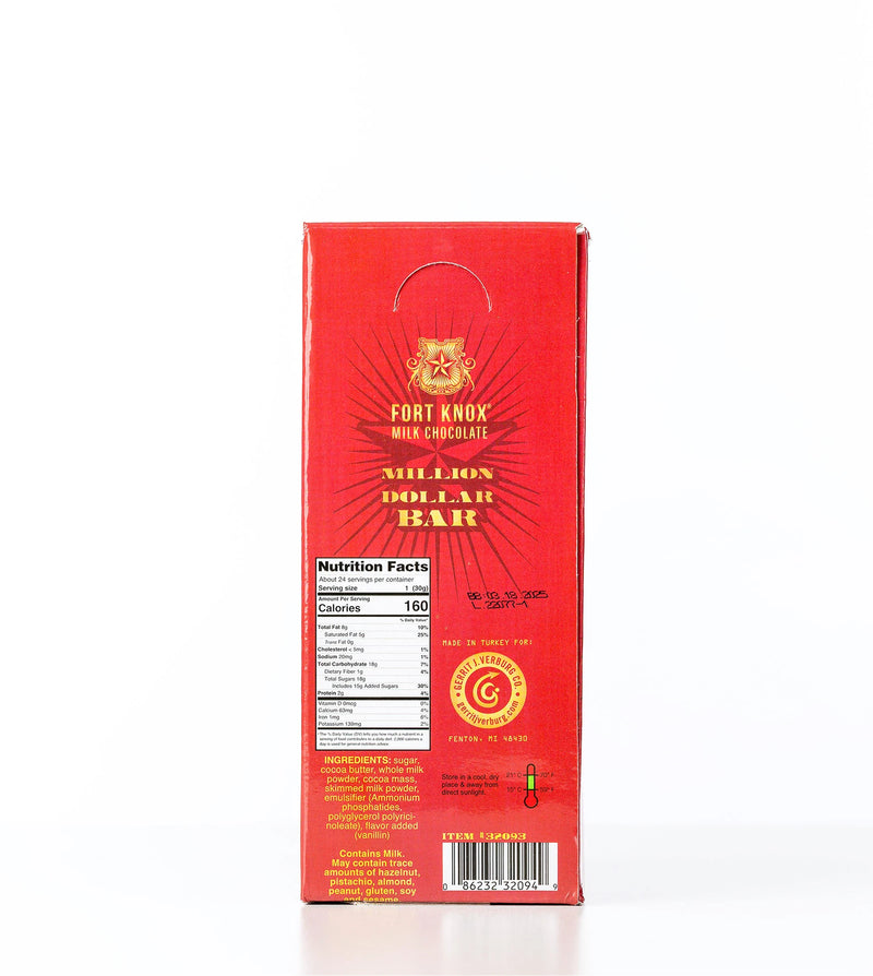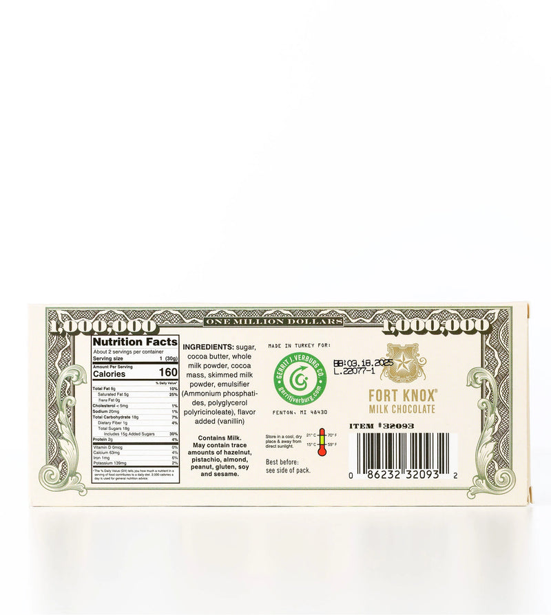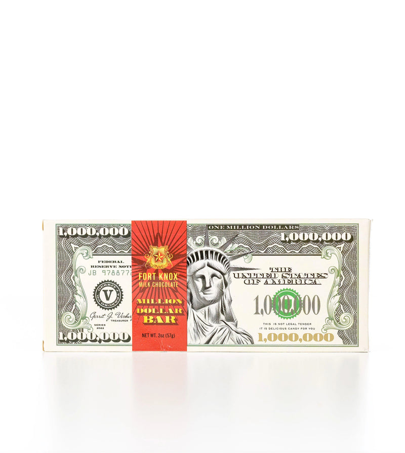 Indulge in Rich, Decadent Luxury! 🍫💰 Treat yourself like a millionaire with the Fort Knox Million Dollar Bar, a premium milk chocolate experience wrapped in pure gold style! ✨ Each bar is crafted with smooth, creamy chocolate that melts in your mouth, delivering a rich and satisfying taste in every bite. Wrapped in an eye-catching gold foil "million-dollar" design, this delicious treat makes the perfect gift, party favor, or personal indulgence. 🎁 Whether you're celebrating a special occasion or just craving something sweet, the Fort Knox Million Dollar Bar is your golden ticket to pure chocolate bliss! 🏆