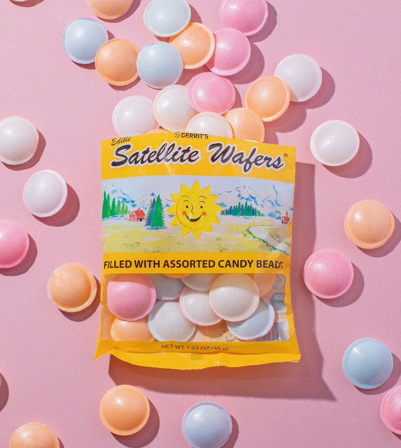The candy quickly became a hit across Europe, especially in the UK and the Netherlands, during the post-war space craze, thanks to its futuristic, flying saucer appearance. Lightweight, fun to eat, and filled with fizzy powder, Satellite Wafers became a staple in retro sweet shops and remain a beloved novelty candy today."