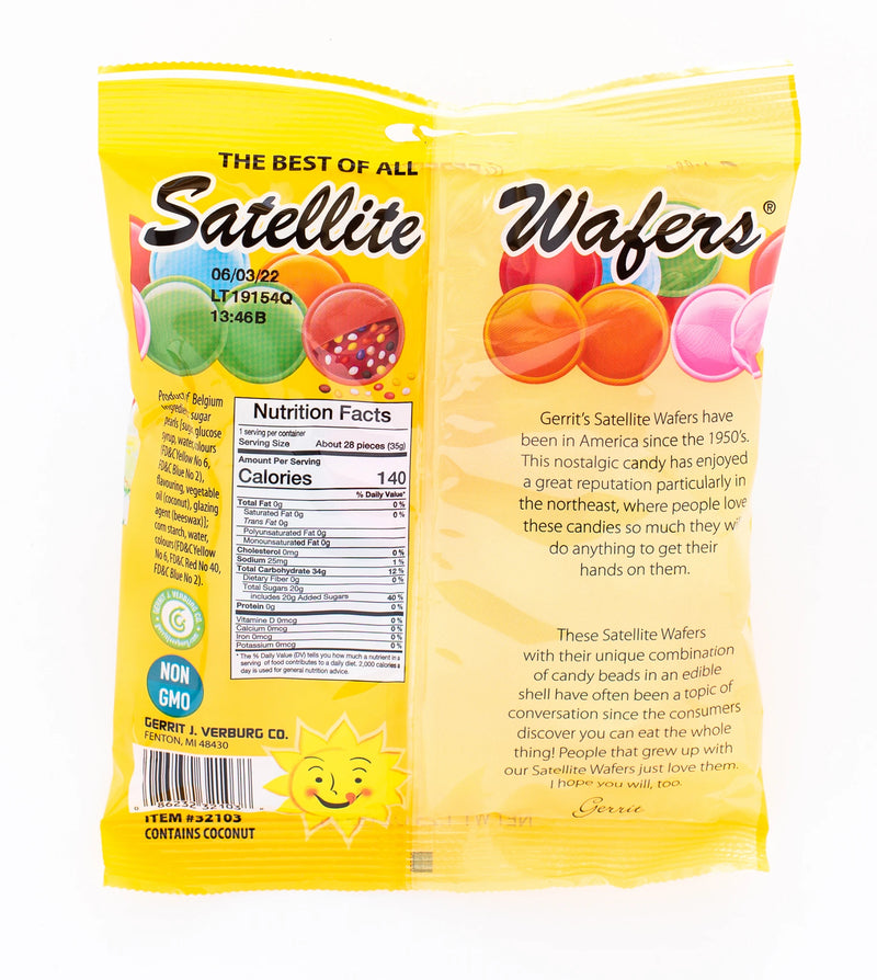 Gerrit's Satellite Wafers are a nostalgic treat that has delighted candy lovers since the 1950s. These edible cornstarch saucers are filled with colorful candy beads, offering a fun and flavorful experience. They are perfect for sharing or enjoying on your own. Gluten-free, GMO-free, and nut-free, these wafers are suitable for a wide range of dietary preferences. Whether you're revisiting a childhood favorite or discovering them for the first time, Gerrit's Satellite Wafers are a treat out of this world! 🛸 "SKU #32103 Case Pack: 12 Bags x 1.23oz (Approx. 28 Pieces)"