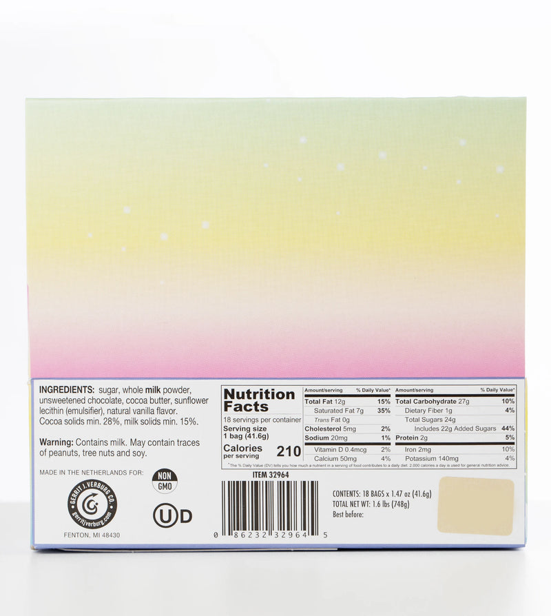 Sugar, whole milk powder, unsweetened chocolate, coca butter, sunflower lecithin (emulsifier), natural vanilla flavor. Cocoa solids min. 28%, milk solids min. 15%.