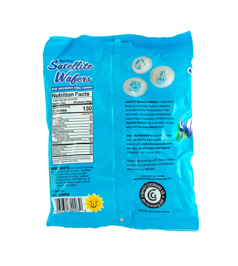 Gerrit’s® Blue Raspberry Satellite Wafers deliver a burst of bold, fruity flavor that combines sweet and tangy blue raspberry goodness. The thin, crispy outer shell melts in your mouth, revealing a delightful surprise of fizzy candy pearls inside, adding a fun texture and pop of sweetness. But the fun doesn’t stop there—each wafer comes with an edible tongue tattoo, making snack time interactive and uniquely enjoyable. Whether you’re savoring the nostalgic charm or sharing laughs with friends, this treat is as exciting as it is delicious. Perfect for kids and kids-at-heart! 🚀💙✨