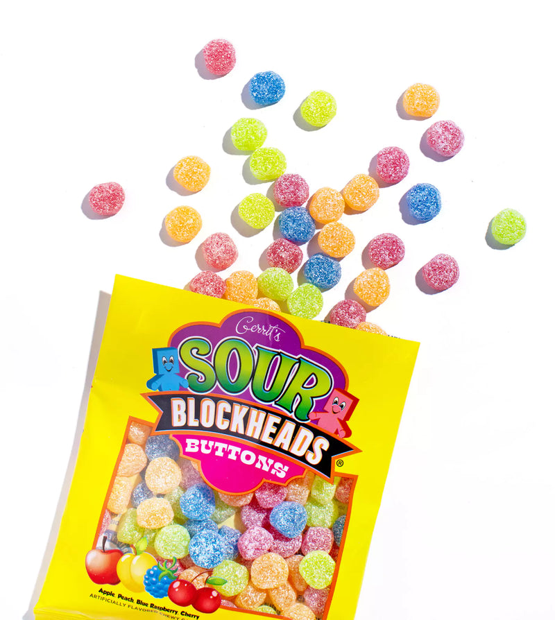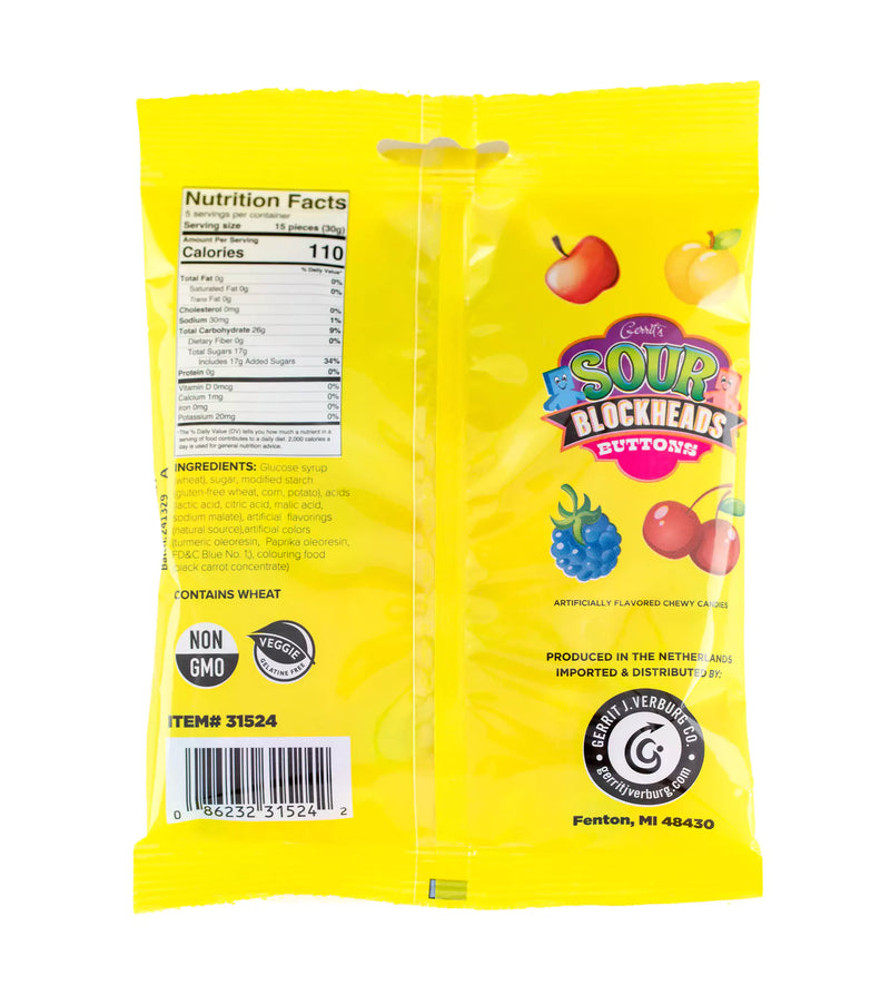 Treat your taste buds to a burst of fruity fun with Gerrit's® Sour Blockheads Buttons! These bite-sized sour candies come in juicy peach, crisp apple, tangy blue raspberry, & sweet cherry flavors. 🧡💚💙❤️ Crafted in the Netherlands with exceptional quality, they’re perfect for sharing, gifting, or indulging solo. Grab a bag and let the sour adventure begin!