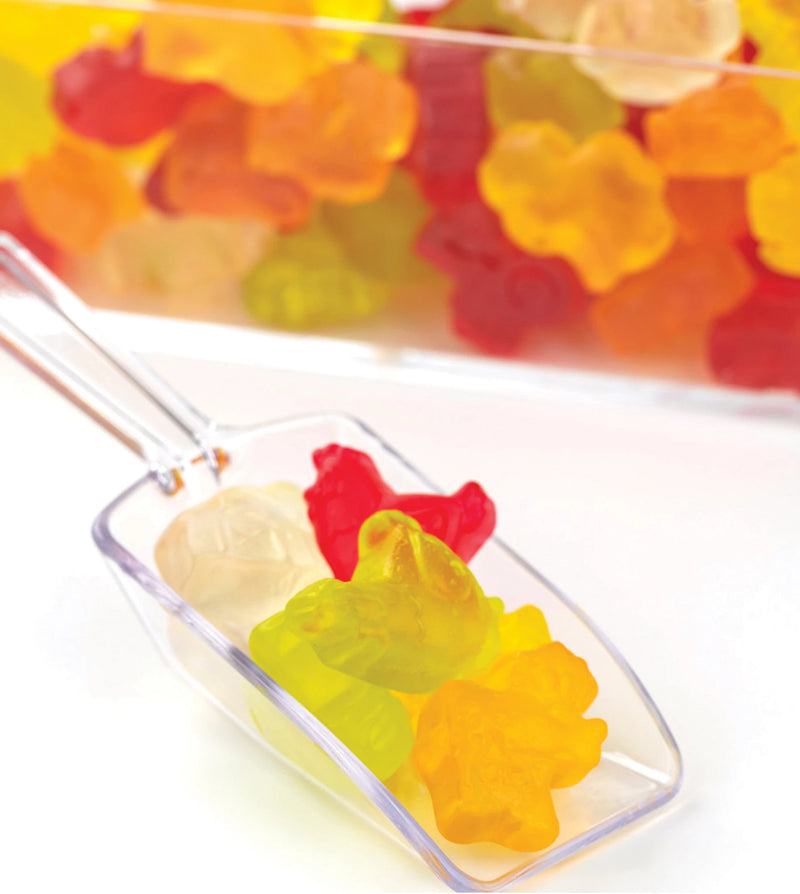 Glucose Syrup, Sugar, Pork Gelatin, Acidifier (Citric Acid), Coloring (Turmeric- Natural, Carmine- Natural, FD&C Blue No. 1- Artificial), Natural Flavorings (Apple, Lemon, Raspberry, Pear, Orange), Vegetable Oil (Coconut), Glazing Agent (Carnauba Wax).