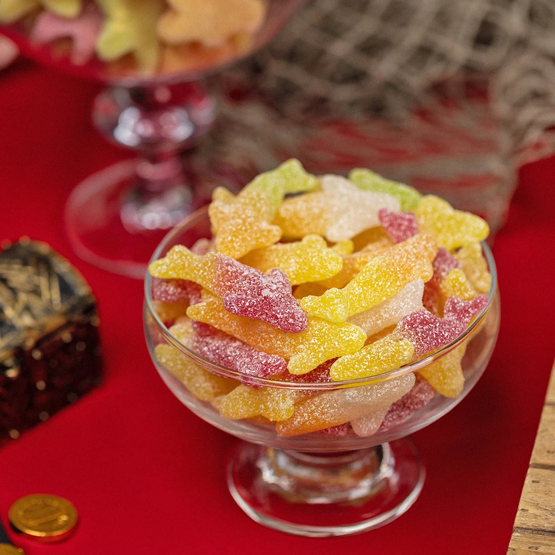 Dive into a sea of flavor with Gustaf's® Sour Gummy Sharks! 🦈 These fun, shark-shaped gummies offer a tantalizing blend of sweet and sour in every bite. Each aquatic predator comes in a variety of fruity flavors, including apple, lemon, raspberry, pear, and orange. Made with GMO-free ingredients, these gummies are perfect for parties, movie nights, or simply satisfying your sweet tooth.