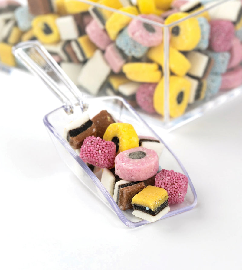 Jelly Buttons (Spogs)—Chewy anise-flavored centers coated in crunchy, candy beads in bright pink and blue hues