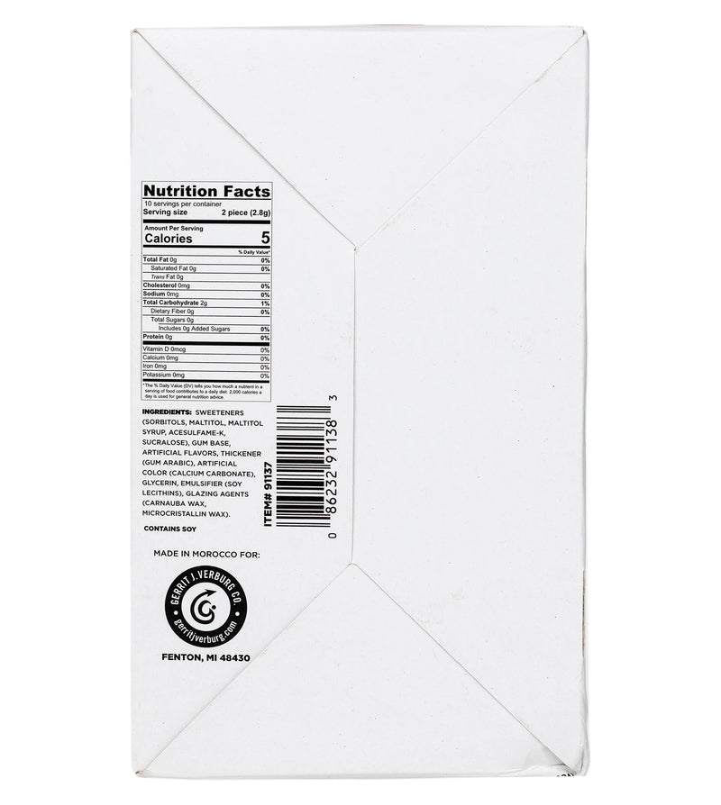 Sweeteners (Sorbitols, Maltitol, Maltitol Syrup, Acesulfame-K, Sucralose), Gum Base, Artificial Flavors, Thickener (Gum Arabic), Artificial Color (Calcium Carbonate), Glycerin, Emulsifier (Soy Lecithins), Glazing Agents (Carnauba Wax, Microcristallin Wax).